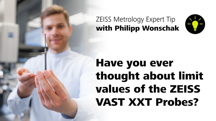 In der Messtechnik gibt es Grenzen, die eingehalten werden müssen. So ist beispielweise die Einhaltung verschiedener Grenzbereiche der Verlängerungen für die ZEISS VAST XXT Messköpfe von besonderer Bedeutung, um verlässliche Messergebnisse zu erzielen. Wie sich diese Grenzwerte ergeben und Sie diese einhalten, erklärt Ihnen unser Experte, Philipp Wonschak, in diesem Video.