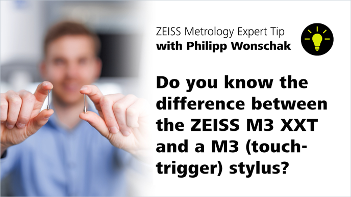 In diesem ZEISS Messtechnik Experten Tipp Video erläutert Ihnen Philipp Wonschak detailliert den Unterschied zwischen einem ZEISS M3 XXT Taster sowie einem M3 Taster (schaltend) und erklärt, warum niemals ein normaler M3 Taster mit einem VAST XXT Messkopf angewendet werden darf.