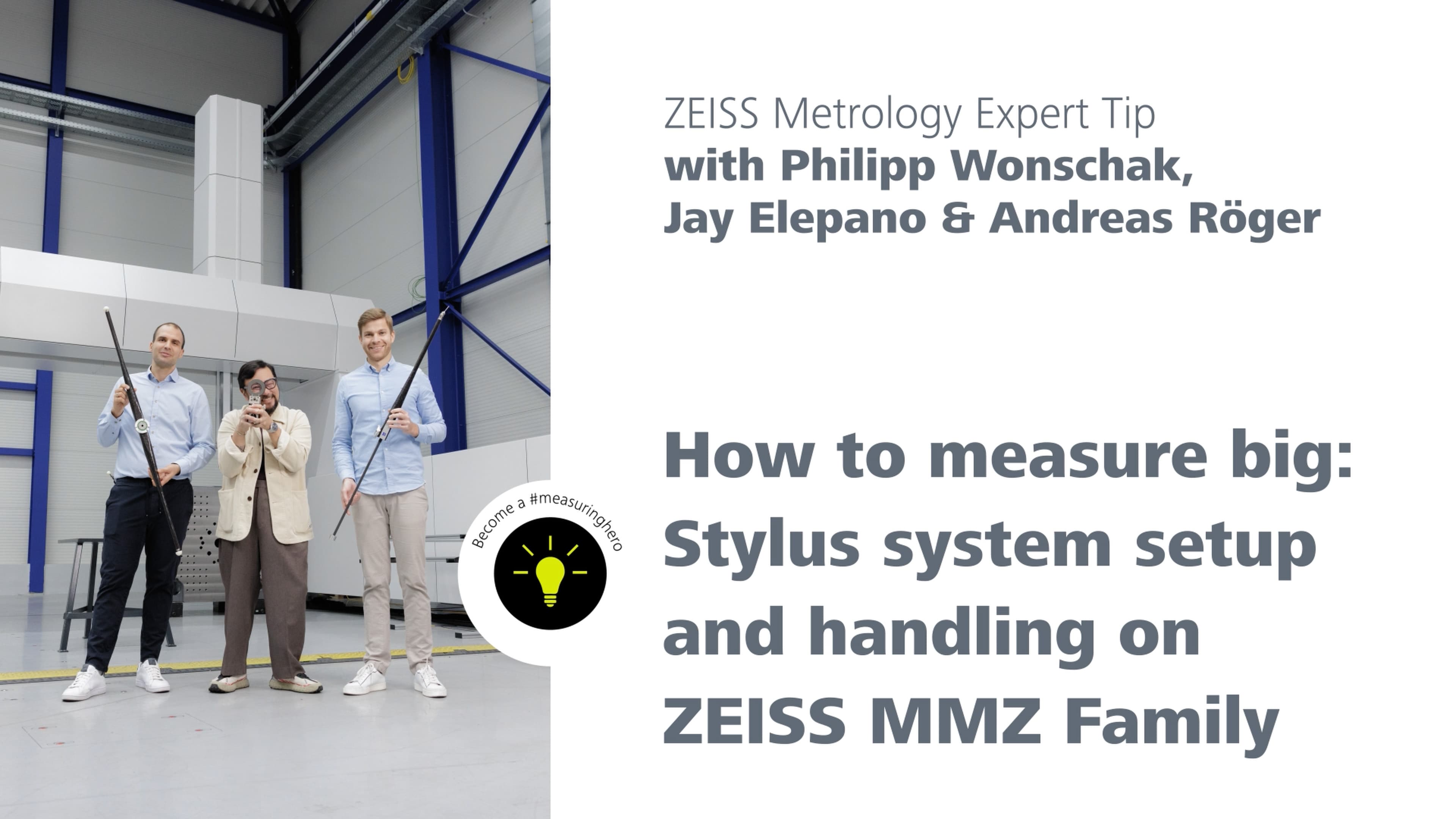 Oft sind es die kleinen Tricks, welche die Arbeit in der Messtechnik noch effizienter und präziser machen – genau hier setzen unsere ZEISS Messtechnik Experten Tipps an. In Staffel 2 erhalten Sie erneut zahlreiche praxisnahe und wertvolle Tipps rund um das Original ZEISS Zubehörportfolio und mehr – veranschaulicht anhand praxisnaher Beispiele aus den Bereichen Medical, Aerospace, Power & Energy, Electronics sowie Automotive & NEV. So holen Sie das Beste aus Ihrem ZEISS Koordinatenmessgerät, Ihrem optischen 3D-Messsystem oder Ihrem CT-/Röntgensystem heraus. Das Highlight: #measuringhero Jay Elepano ist mit dabei! Gemeinsam mit Philipp Wonschak (bekannt aus der ersten Staffel) und weiteren ZEISS Experten bietet Staffel 2 eine spannende Mischung aus Know-how und Inspiration.