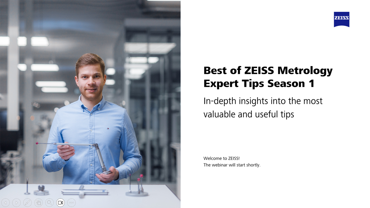 Ganz gleich, ob Sie Ihre Kenntnisse auffrischen oder vertiefen möchten - wenn Sie die Leistung Ihres Koordinatenmessgeräts maximieren wollen, sollten Sie sich die Aufzeichnung des „Best of ZEISS Mestechnik Experten Tipps Webinars“ nicht entgehen lassen. Entdecken Sie die wertvollsten und nützlichsten Tipps & Tricks der ersten Staffel auf einer neuen Ebene. Unser Experte, Philipp Wonschak, gibt Ihnen vertiefende Einblicke, wertvolle Hintergrundinfos und erläutert, welches Ziel alle Tipps gemeinsam haben und welche weiteren Faktoren das Messergebnis maßgeblich beeinflussen.